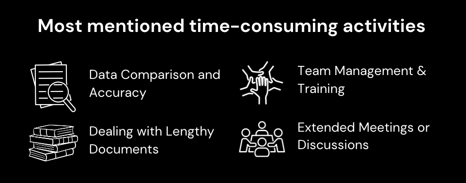 Time-Consuming Actions: Tasks like data comparison, team management, and dealing with lengthy documents emerge as significant time drains.